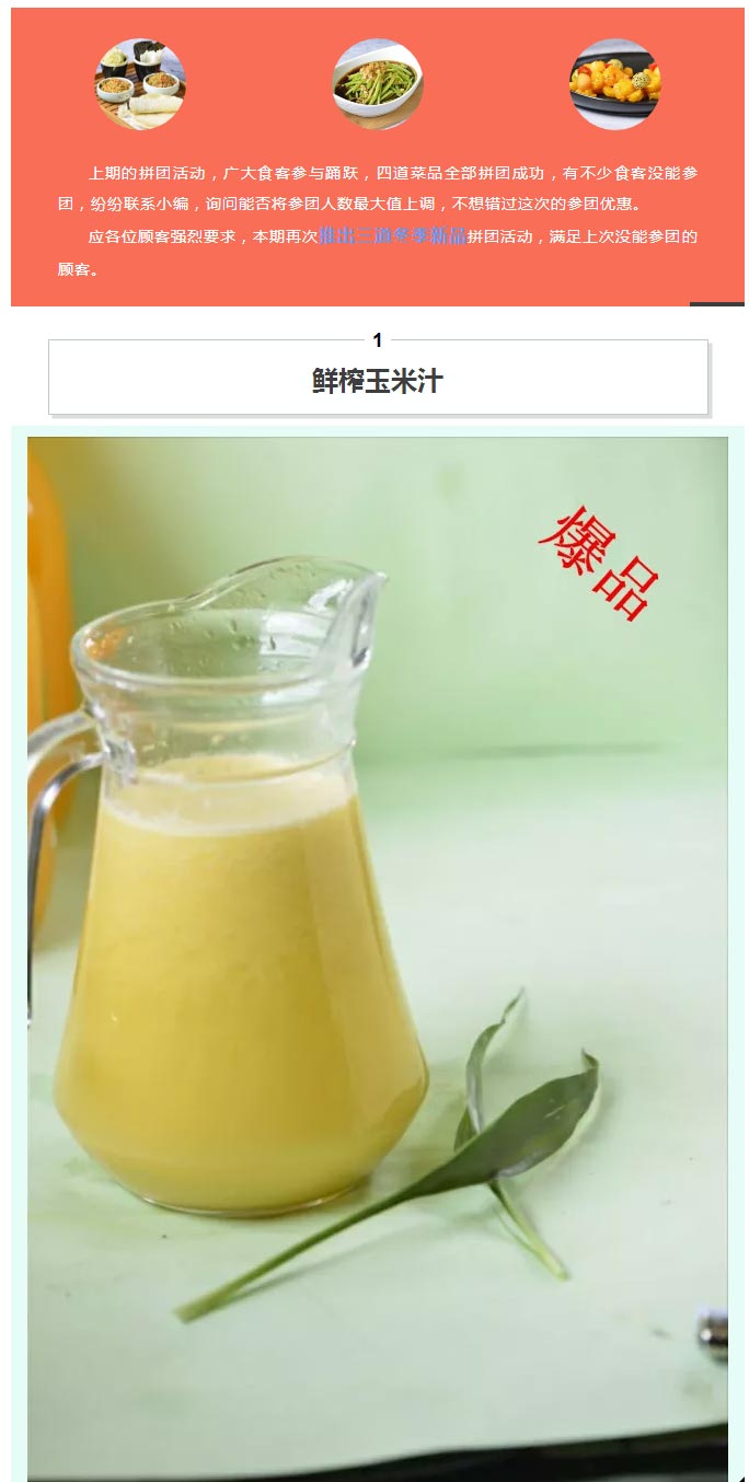 3、每道菜都可參團(tuán)一次,該道菜滿(mǎn)50人支付成功則拼團(tuán)結(jié)束。